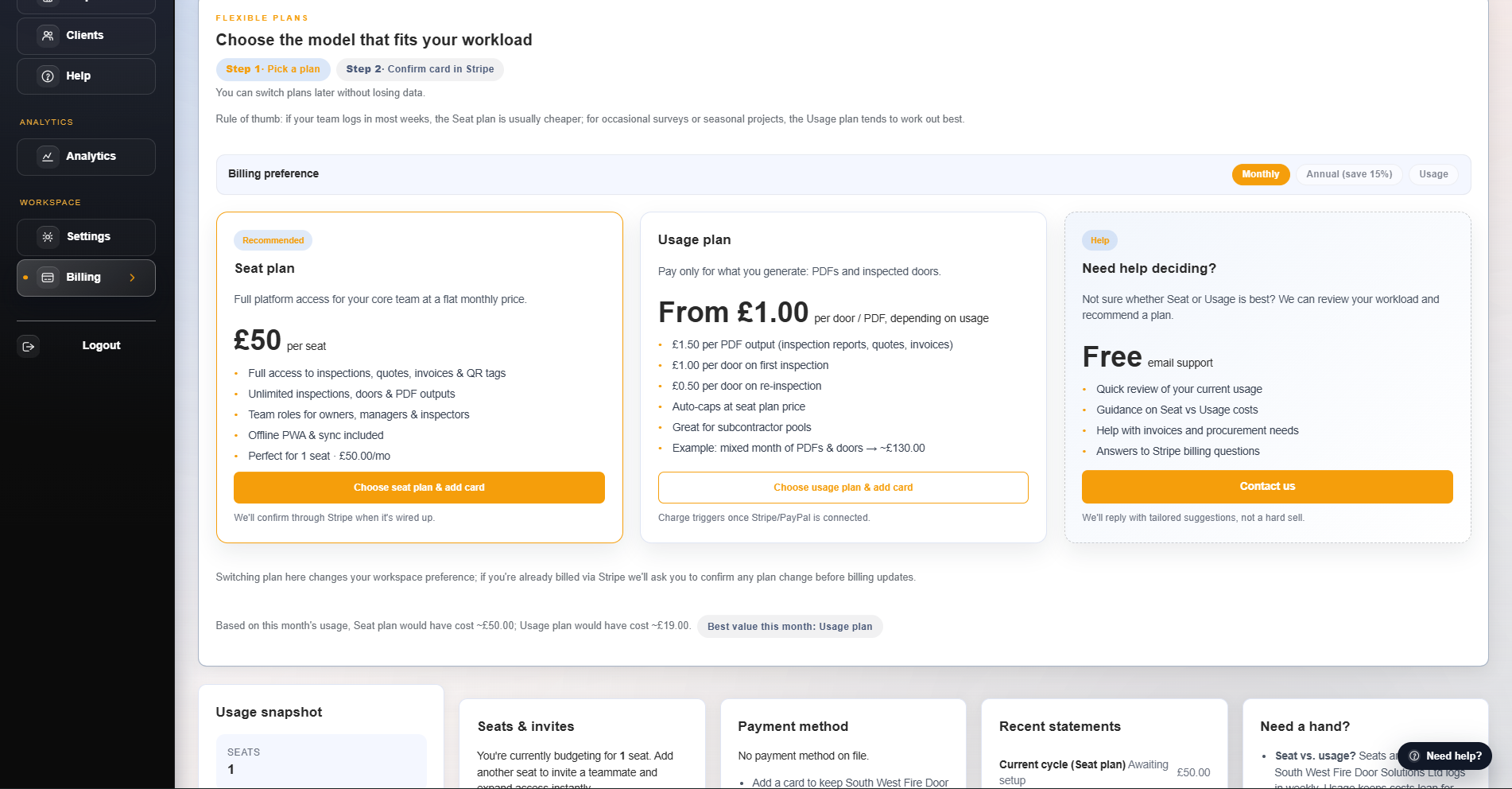 Start with a full‑access trial, then choose between Usage pricing (pay per door/PDF) or a flat Seat plan at £50 per user per month.